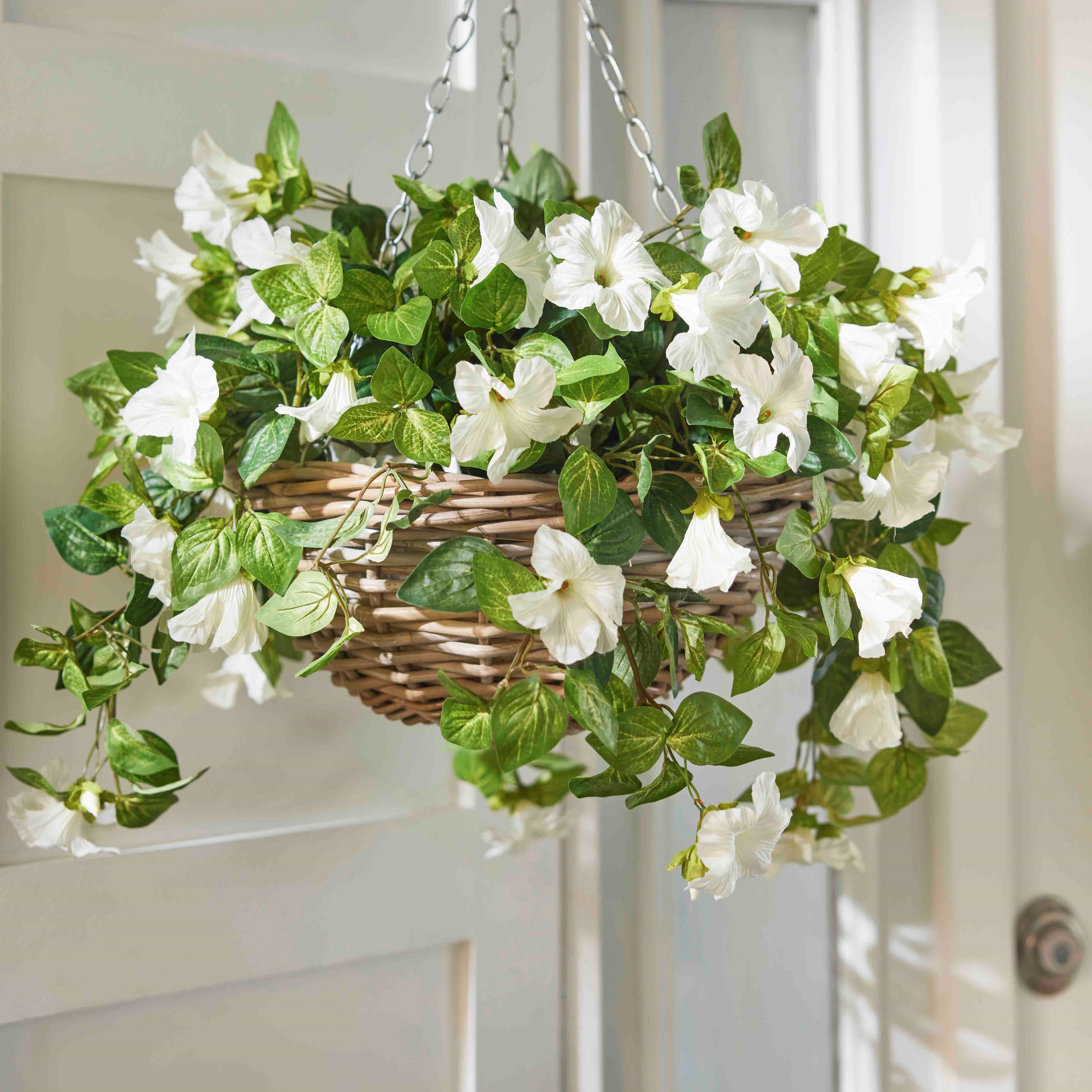 Enhance your home with our Cascading White Petunia Artificial Plant in Round Rattan Hanging Basket. With lifelike white petals cascading down the sides, this low-maintenance plant adds a touch of elegance to any space. The round rattan hanging basket provides a natural and stylish look.