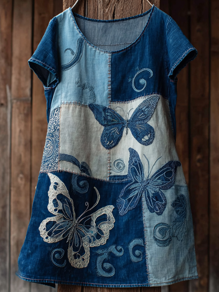 Japanese Art Style Butterfly And Plant Flower Pattern Embroidery Women's Cotton And Linen Dress.
