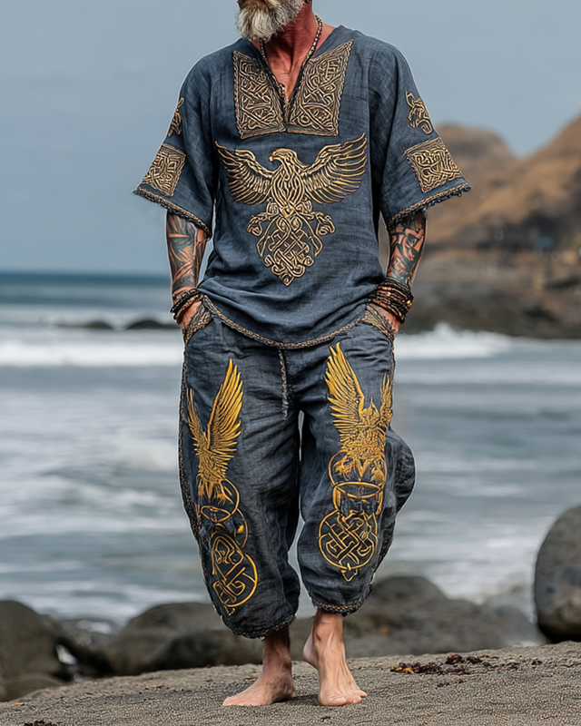 Men's Vacation Viking 3D Embroidered Linen Top & Pants 2-Piece Set 441b