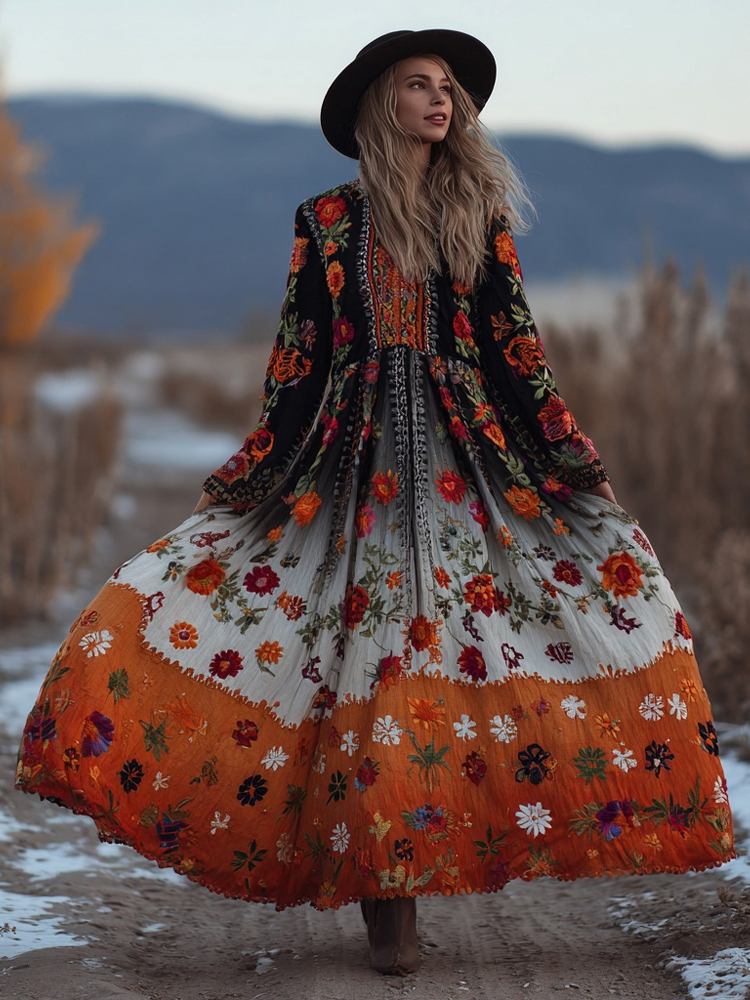 Mexican Flowers Embroidered Gradient Flowy Linen Maxi Dress