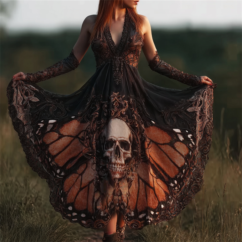 Vintage Mystical Skull Butterfly Flowy Wide Skirted Dress