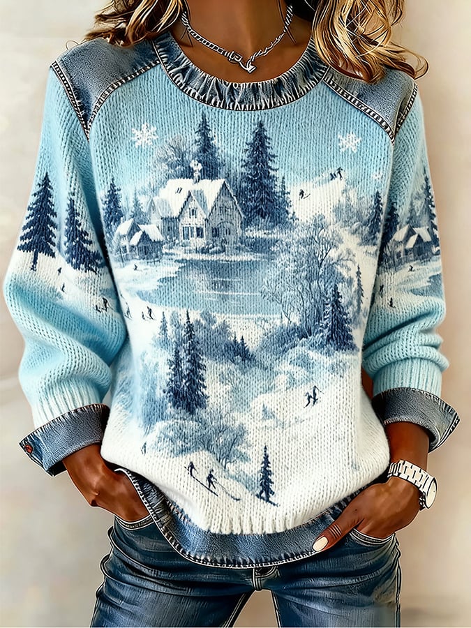 Women's Winter Retro Christmas Snow Scene Print Faux Denim Patchwork Top